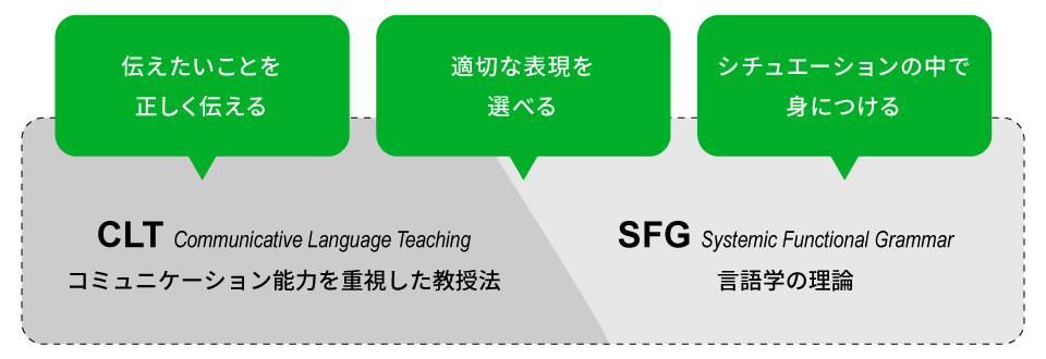 Gabaメソッドは、「伝えたいことを正しく伝える」「適切な表現を選べる」「シチュエーションの中で身につける」この3つのポイントに加えて、言語学の理論(SFG)と、コミュニケーション能力を重視した教授法(CLT)をもとに構築された実際に使える英語を身につけるメソッドです。最新の言語学と教授法をもとに、確かな上達をサポートいたします。