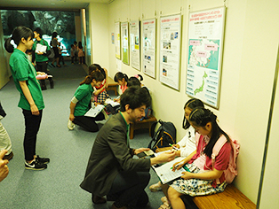 参加者は小学1、2年生の“Penguins”チームと、3、4年生の“Dolphins” チームに分かれて水族館を見学。館内の生き物にちなんだクイズを解きながら、英語を学ぶアクティビティにチャレンジしました。最初は英語での会話を恥ずかしがっていたお子さまたちも、時間が経つごとにすっかり慣れた様子で、“What is the biggest whale in the world? (最も大きい鯨はどれでしょう?)”などの質問に“Blue whale!”と元気に応えてくれました。