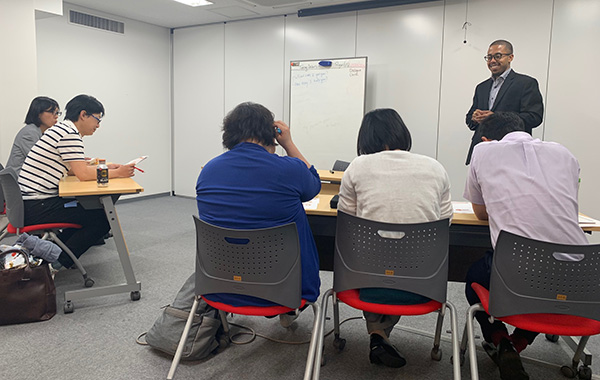 当日は、KKDJの従業員計20名が参加。飲食店での応対に特化したGabaオリジナルの教材を使用し、ペアワーク等を通じて接客時に役立つ単語・フレーズを学習したほか、KKDJの店舗でのシチュエーションに置き換えた、実践形式の英語表現を学びました。