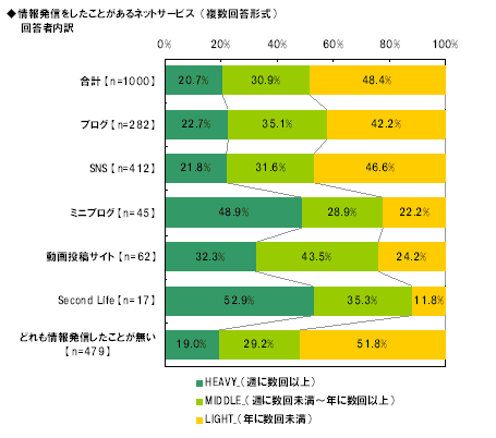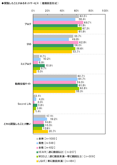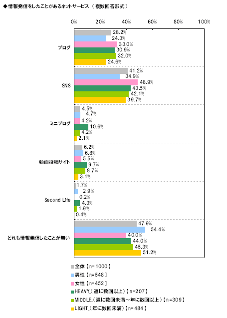 「情報発信をしたことがあるネットサービス」についても同様に聞いたところ、こちらは多い順に「SNS」41.2%、「ブログ」28.2%、「動画投稿サイト」6.2%、「ミニブログ(Twitter等)」4.5%、Second Life1.7%となり、「閲覧」と「情報発信」の使い分けがおこなわれていることがわかりました。