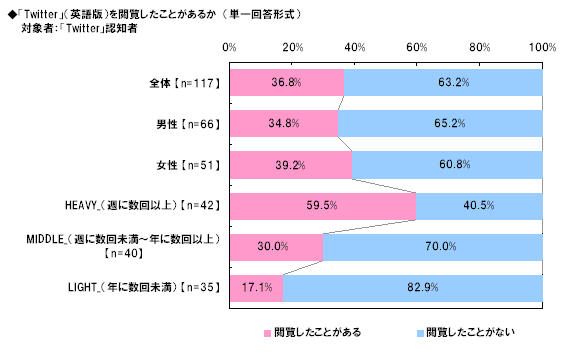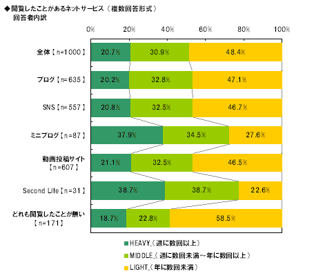 また「ミニブログ」や「Second Life」を「閲覧」「情報発信」している人たちの英語使用頻度をみると、ほかのサービスに比べ、仕事で英語を使用する頻度が高い人の割合が高くなっています。英語の仕事での使用頻度が、週に数回以上の回答者を「ヘビー」、週に数回未満~年に数回以上の回答者を「ミドル」、年に数回未満の回答者を「ライト」としたときに、全体では「ヘビー」層が占める割合が20.7%となっているのに比較し、「ミニブログの閲覧利用者」では37.9%、「ミニブログの情報発信者」では48.9%と、「ヘビー」層の占める割合が非常に高い比率になっているという結果になりました。