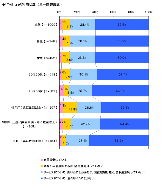 マンツーマン専門の英会話スクールを運営する株式会社GABA(https://www.gaba.co.jp/)では、「Twitterに関する利用実態調査」をモバイルリサーチ(携帯電話によるインターネットリサーチ)により、2009年9月18日~9月23日の6日間において実施し、1000名(調査対象者:仕事での英語使用経験者、20代~50代の男女、有職者)の有効サンプルを集計いたしました。