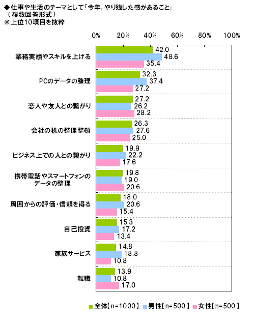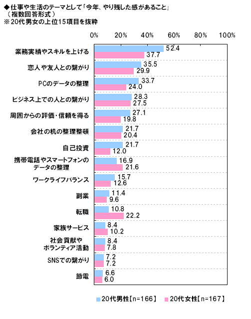 まず、仕事や生活のテーマとして「今年、やり残した感があること」を聞いたところ、全体では「業務実績やスキルを上げる」(42.0%)が最も多く、次いで「PCのデータ整理」(32.3%)、「恋人や友人との繋がり」(27.2%)、「会社の机の整理整頓」(26.3%)が続き、「業務実績やスキルを上げる」(男性48.6%、女性35.4%)、「PCのデータ整理」(男性37.4%、女性27.2%)では男性が女性より10ポイント以上高くなりました。また、20代の男女間では、「自己投資」(20代男性21.7%、20代女性12.0%)や「転職」(20代男性10.8%、20代女性22.2%)において、顕著な違いが見られました。