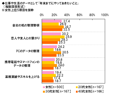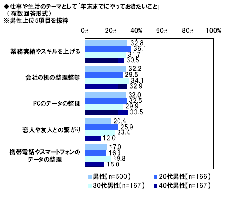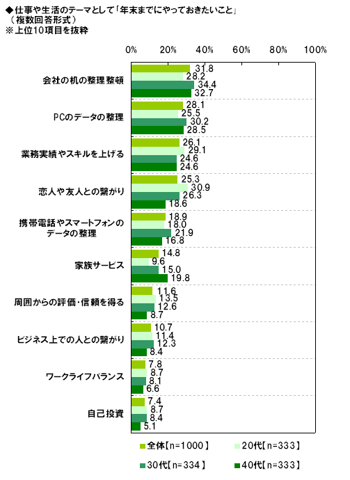 次に、仕事や生活のテーマとして「年末までにやっておきたいこと」を聞いたところ、全体では「会社の机の整理整頓」(31.8%)、「PCのデータの整理」(28.1%)、「業務実績やスキルを上げる」(26.1%)、「恋人や友人との繋がり」(25.3%)が上位となりました。性年代別で見ると、20代では「恋人や友人との繋がり」(30.9%)、「業務実績やスキルを上げる」(29.1%)が上位2項目となり、20代女性では「恋人や友人との繋がり」(35.9%)、20代男性では「業務実績やスキルを上げる」(36.1%)がそれぞれ1位となりました。また、40代男性では「PCのデータの整理」が33.5%で1位になりました。 ビジネス面では、机やPCの整理整頓を、プライベート面では、恋人や友人など人との繋がりを、年末までの限られた時間で優先したいと思っているビジネスパーソンの心情が窺えます。