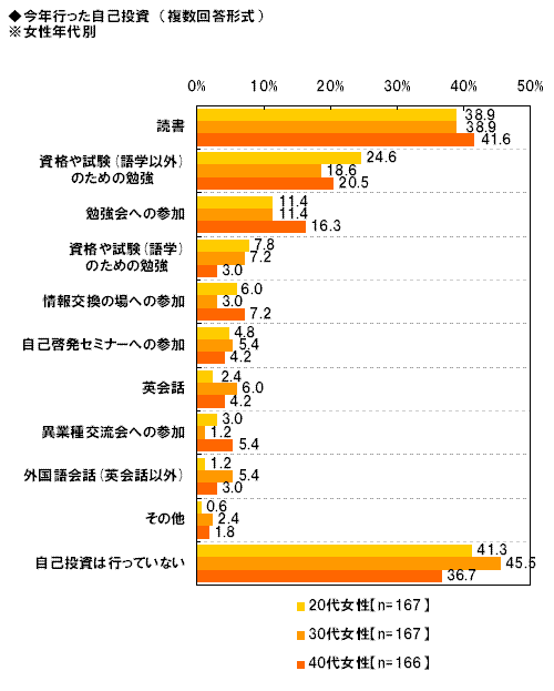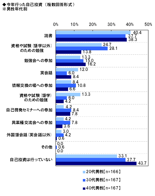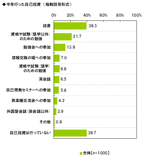 まず、今年行った自己投資を聞いたところ、全体では「読書」(39.3%)が最も多く、次いで「資格や試験(語学以外)のための勉強」(21.7%)、「勉強会への参加」(13.9%)が続きました。性年代別で見ると、20代男性による「資格や試験(語学)のための勉強」(13.3%)や「英会話」(12.0%)に対する自己投資が目立つ結果となりました。