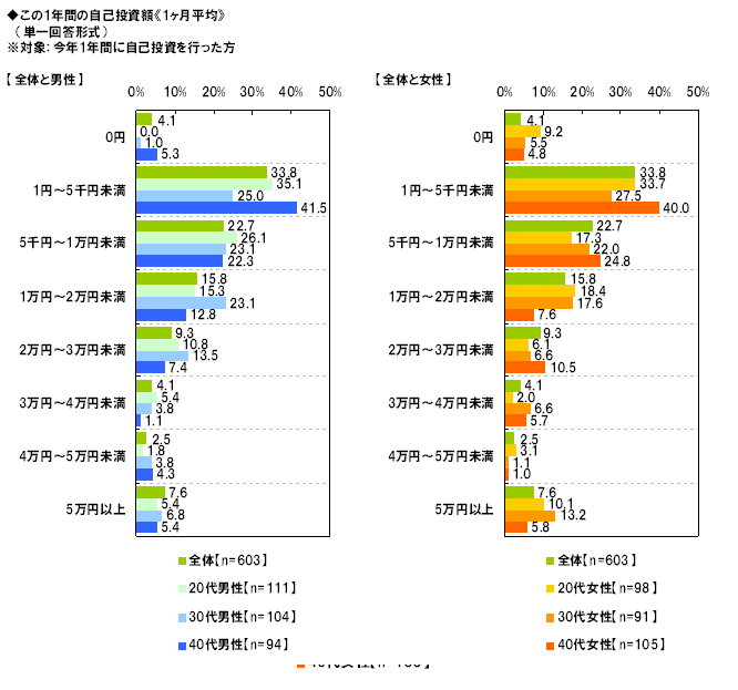 次に、今年自己投資を行った603名に、この1年間の自己投資額(1ヶ月平均)を聞いたところ、全体では「1円~5千円未満」が33.8%、「5千円~1万円未満」が22.7%と「1万円~2万円未満」が15.8%となり平均は16405.47円となりました。