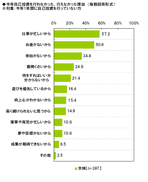 また、「今年自己投資を行った」層は6割(603名)となりましたが、「今年は自己投資を行っていない」397名に、自己投資を行わなかった、行えなかった理由を聞いたところ、「仕事が忙しいから」(57.2%)が6割弱、「お金がないから」(50.6%)が5割となりました。
