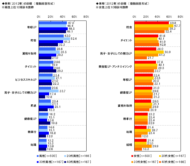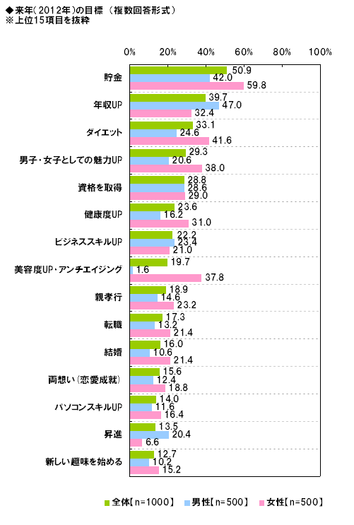 来年(2012年)の目標を聞いたところ、「貯金」(50.9%)が最も多く、次いで「年収UP」(39.7%)、「ダイエット」(33.1%)、「男子・女子としての魅力UP」(29.3%)、「資格を取得」(28.8%)が続きました。