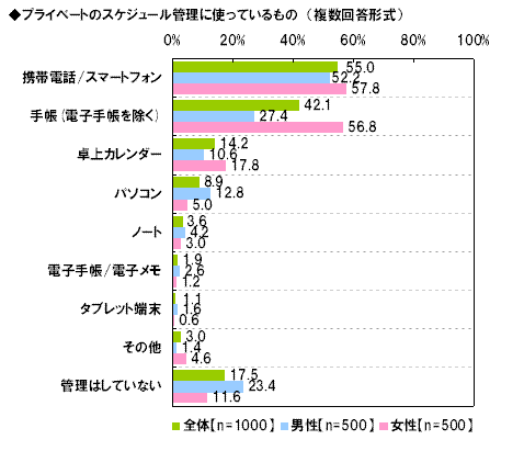 また、“プライベートのスケジュール”では「携帯電話/スマートフォン」(55.0%)が最も多く、「手帳」(42.1%)が続きました。“プライベートのスケジュール”管理での「手帳」利用率は、特に女性で高く、男性の27.4%に対し、女性では56.8%と5割半が手帳を利用しているという結果となりました。