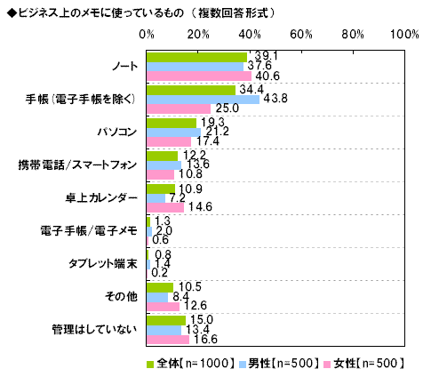 そして、“ビジネス上のメモ”では「ノート」(39.1%)が最も多く、「手帳」(34.4%)、「パソコン」(19.3%)が続きました。