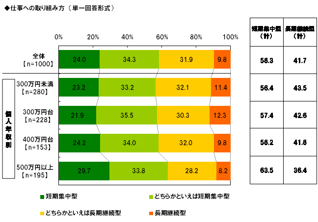 個人年収別に『短期集中型(計)』を見ると、個人年収が300万円未満の層では56.4%、300万円台の層では57.4%、400万円台の層では58.2%、500万円以上の層では63.5%となっており、個人年収500万円以上の層の『短期集中型(計)』は6割強となりました。