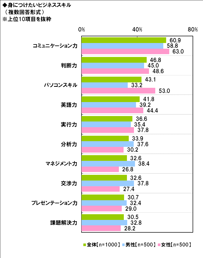 男女別でみると、男性では1位「コミュニケーション力」(58.8%)、次いで「判断力」(45.0%)が4割半、「英語力」(39.2%)、「マネジメント力」(38.4%)、「交渉力」(37.8%)、「分析力」(37.6%)が3割後半で続きました。女性でも「コミュニケーション力」(63.0%)が最も多く、次いで「パソコンスキル」(53.0%)、「判断力」(48.6%)、「英語力」(44.4%)となっています。