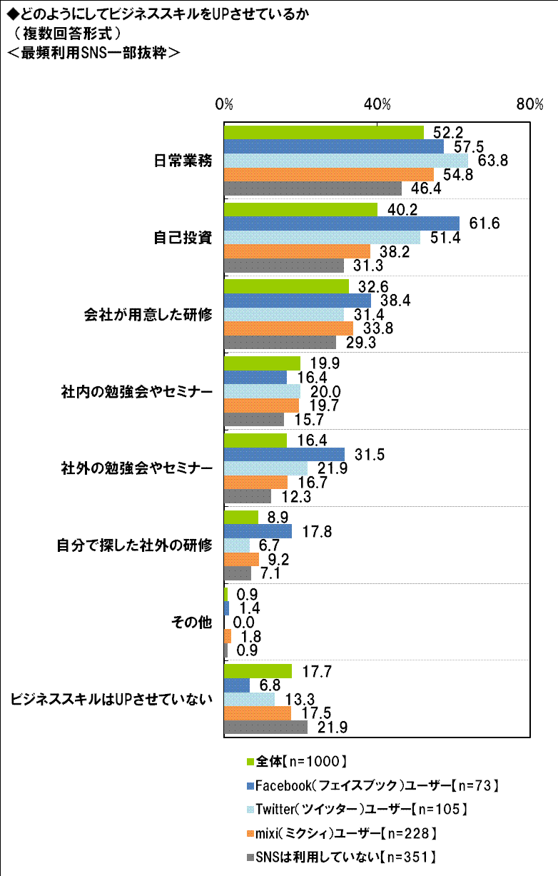 ◆ビジネススキルUPの方法 「日常業務」5割強 Facebookユーザーでは「自己投資」6割強 グラフ2