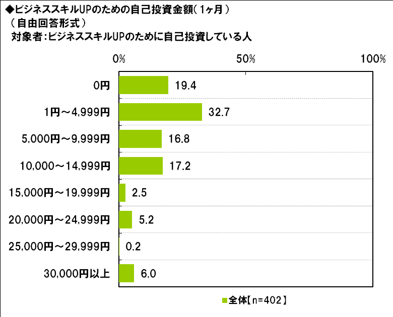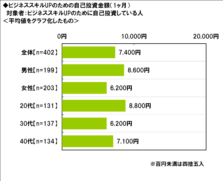 自己投資でビジネススキルをUPさせている人(402名)に、ビジネススキルUPのための自己投資金額(1ヶ月)を自由回答で聞いたところ、全体では「1円~4,999円」が32.7%、「5,000円~9,999円」が16.8%、「10,000円~14,999円」が17.2%でした。「0円」は19.4%となり、自己投資をしているビジネスパーソンの約8割(80.6%)は、自分で費用を負担し自己投資を行っていることがわかりました。また、自己投資金額の平均値を算出したところ、全体では「7,400円」、男性で「8,600円」、女性で「6,200円」となりました。