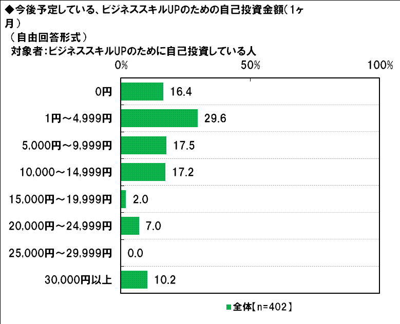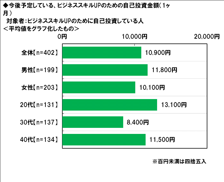 今後予定している、ビジネススキルUPのための自己投資予定金額(1ヶ月)では、全体では「1円~4,999円」が29.6%、「5,000円~9,999円」が17.5%、「10,000円~14,999円」が17.2%となり、「30,000円以上」も10.2%いました。平均値を算出したところ、全体では「10,900円」、男性で「11,800円」、女性で「10,100円」となりました。