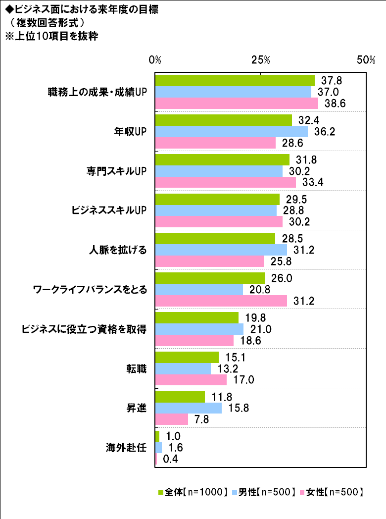 来年度の目標は、全体では「職務上の成果・成績UP」(37.8%)、「年収UP」(32.4%)、「専門スキルUP」(31.8%)、「ビジネススキルUP」(29.5%)となりました。