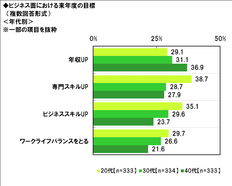 年代別にみると、「専門スキルUP」は20代では38.7%と4割弱となり、他の年代よりも10ポイント以上高くなりました。また、「ビジネススキルUP」や「ワークライフバランスをとる」では、年代が下がるにつれ、来年度の目標とする割合が高くなっており、「ビジネススキルUP」は20代35.1%、30代29.6%、40代23.7%、「ワークライフバランスをとる」は20代29.7%、30代26.6%、40代21.6%となっています。一方、「年収UP」では、年代が上がるにつれ割合が高くなっており、20代29.1%、30代31.1%、40代36.9%となりました。特に40代男性で「年収UP」を目標に設定している割合は高く、40.7%に達しました。