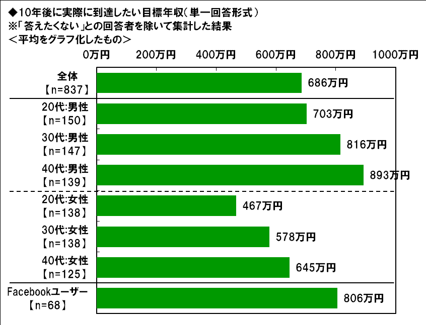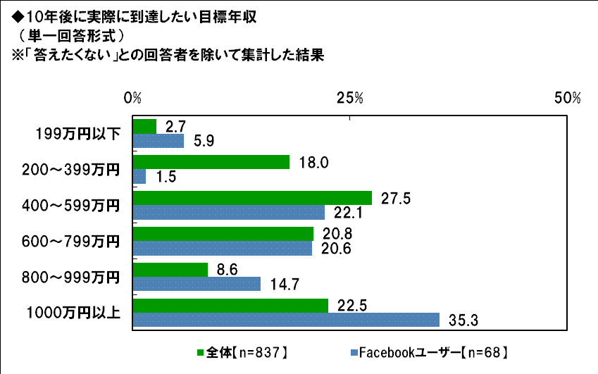 そして、Facebookユーザーについてみると、「1,000万円以上」を目標としているのは35.3%となり、平均は806万円と他のSNSユーザーに比べ高くなりました。