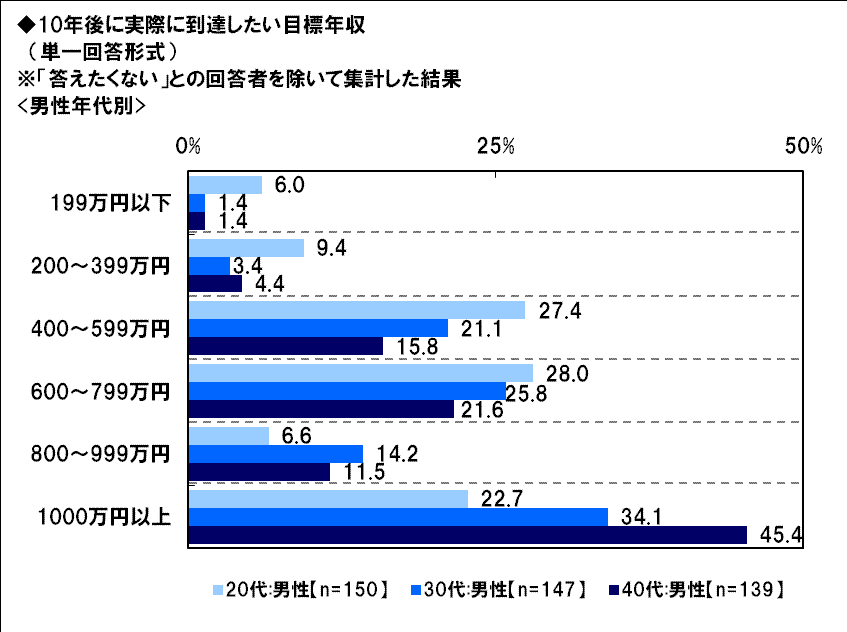 10年後の目標年収は「1,000万円以上」 20代男性で2割強、30代男性では3割半
