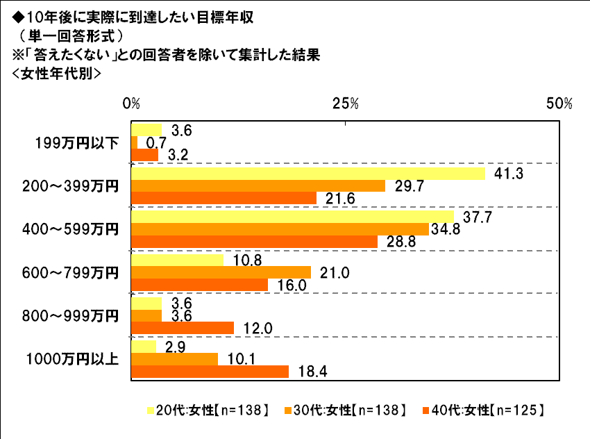 男性では、20代で「400万円~599万円」(27.4%)、「600万円~799万円」(28.0%)の金額帯が多くなっています。「1,000万円以上」を目標としているのは、20代で22.7%、30代で34.1%、40代で45.4%と、年代が上がるにつれて高くなり、10年後の目標年収の平均は、20代703万円、30代816万円、40代893万円となりました。