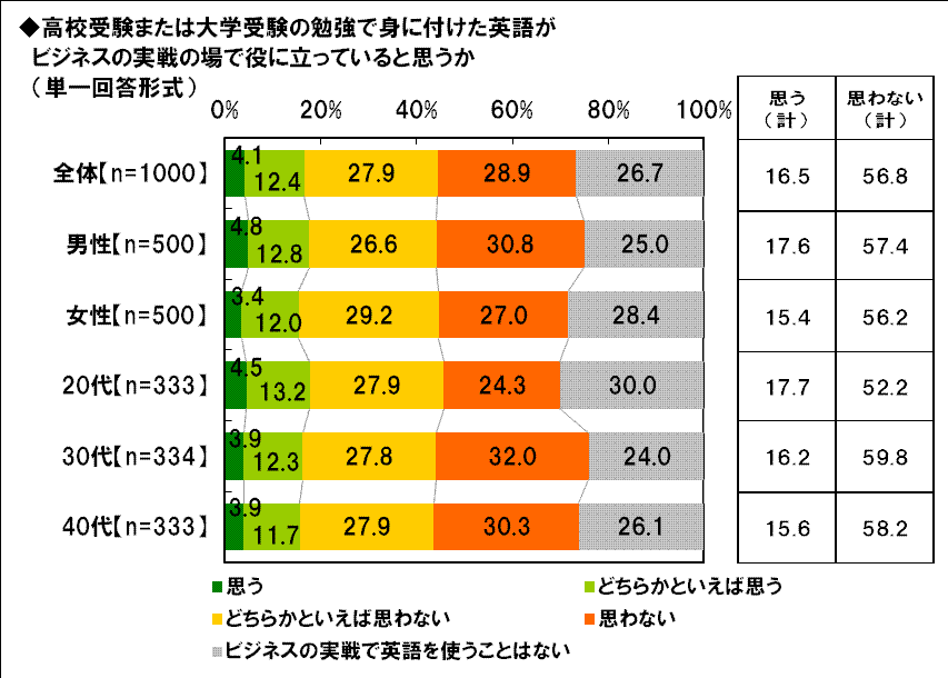 高校受験または大学受験の勉強で身に付けた英語がビジネスの実戦の場で役に立っていると思うかを聞いたところ、『思う』は16.5%(「思う」と「どちらかといえば思う」の合計)、『思わない』56.8%(「思わない」と「どちらかといえば思わない」の合計)、「ビジネスの実戦で英語を使うことはない」26.7%となり、8割以上は受験勉強で身に付けた英語がビジネスの場では役に立っていないか使っていないという結果となりました。
