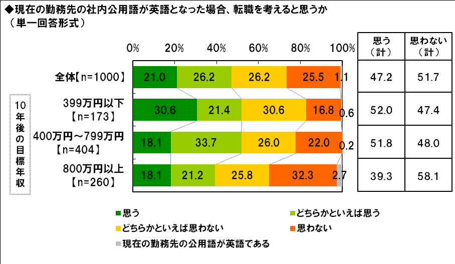 10年後の目標年収別にみると、399万円以下(173名)では、転職を考えると『思う』が52.0%、400万円~799万円(404名)においても51.8%と半数を超えました。目標年収が800万円以上(260名)になると、転職を考えると『思う』は39.3%と4割を切り、勤務先の社内公用語が英語となっても、転職を考えると思う割合が他の年収層に比べ少なくなりました。