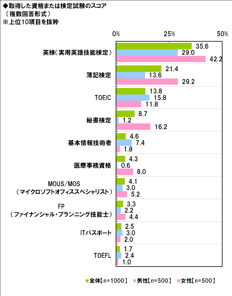 男女別にみると、「英検(実用英語技能検定)」、「簿記検定」、「秘書検定」では、女性のほうが男性よりも10ポイント以上、「医療事務資格」においても5ポイント以上高くなりました。