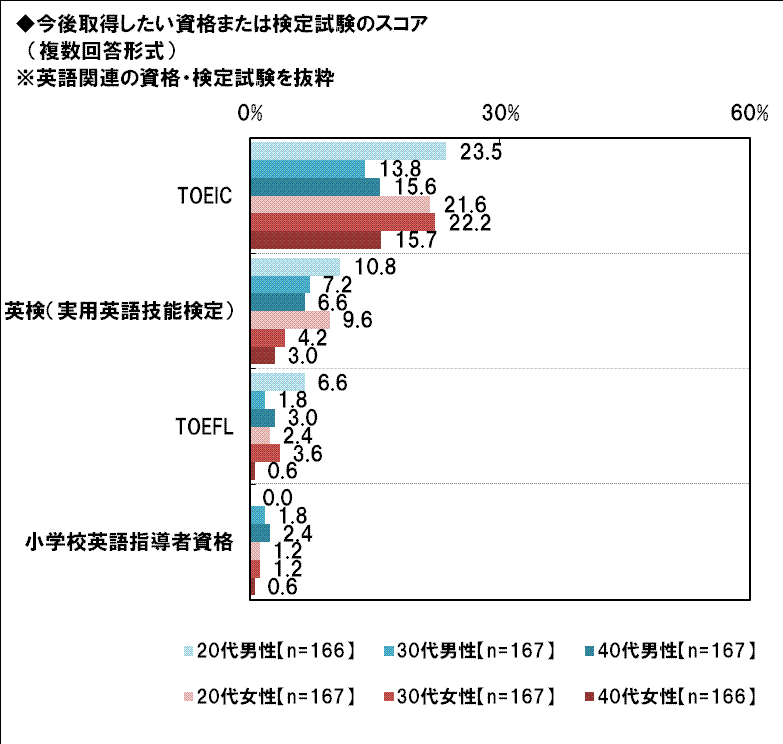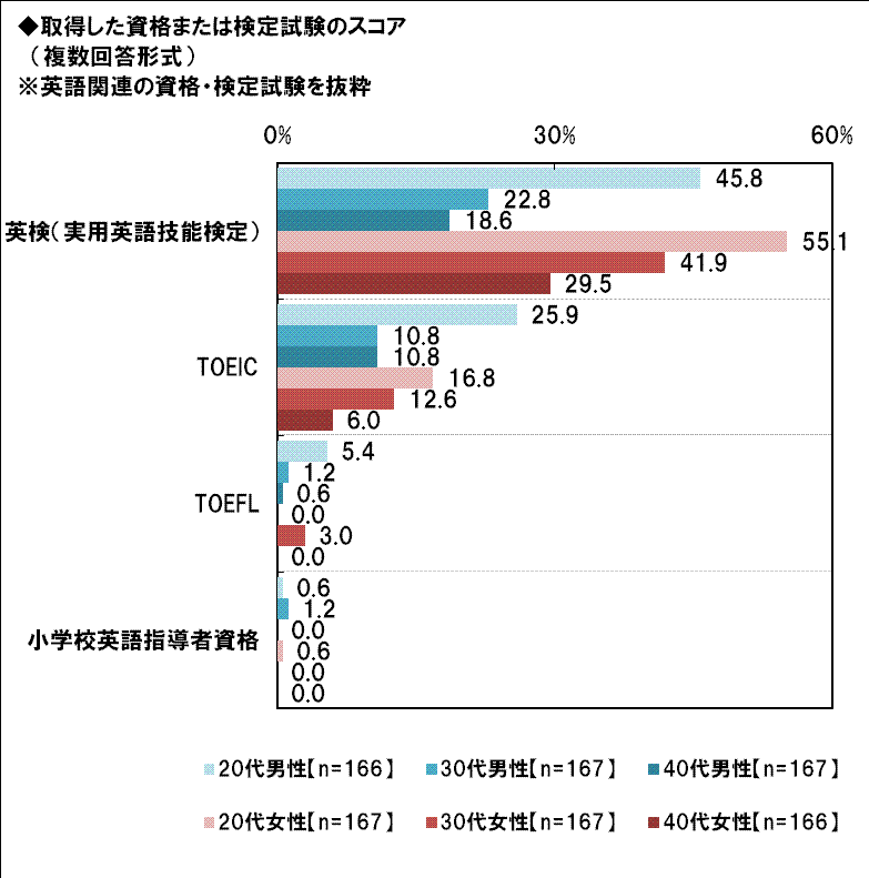 英語関連の資格・検定試験を性年代別でみると、「英検(実用英語技能検定)」は年代が低くなるにつれて高くなり、20代男性で45.8%、20代女性で55.1%となりました。「TOEIC」は20代男性で25.9%と高く、4人に1人が受験していました。
