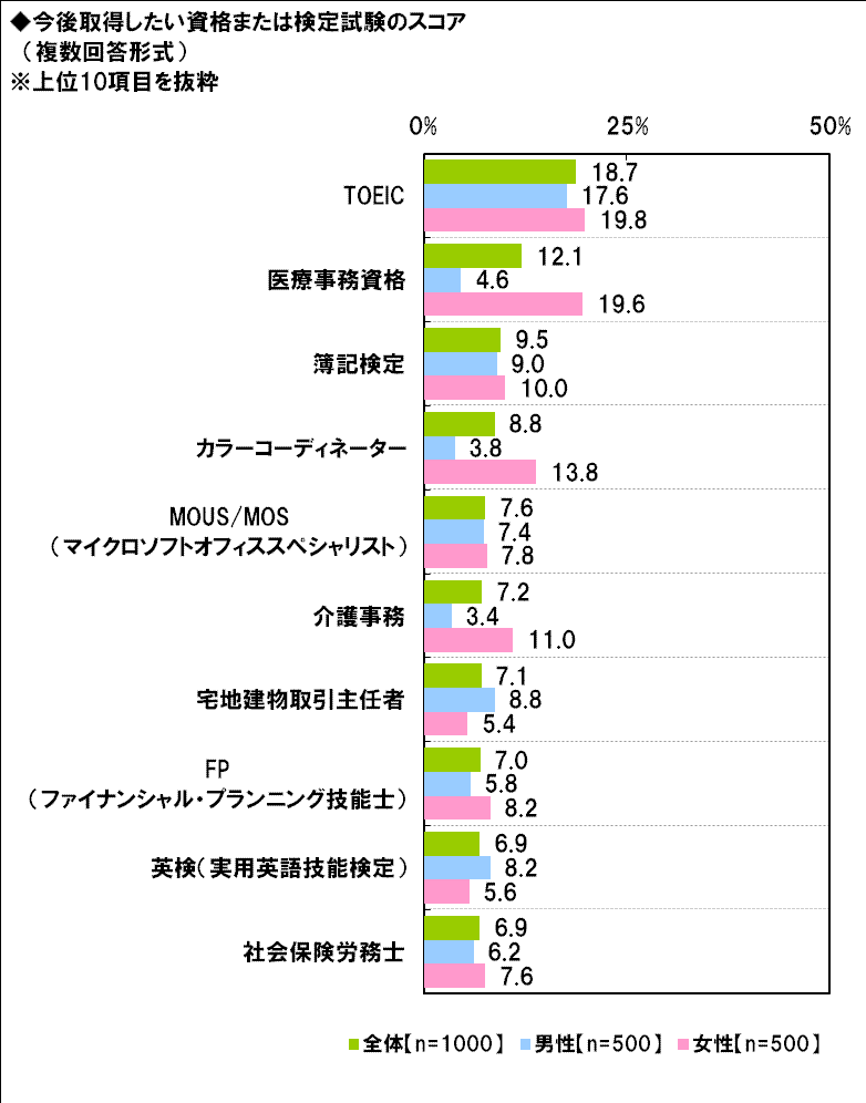 男女別にみると、男性では1位の「TOEIC」(17.6%)が、2位の「簿記検定」(9.0%)よりも8.6ポイント高くなりました。女性では「TOEIC」(19.8%)と「医療事務資格」(19.6%)が人気となり、続いて「カラーコーディネーター」(13.8%)、「介護事務」(11.0%)となっています。