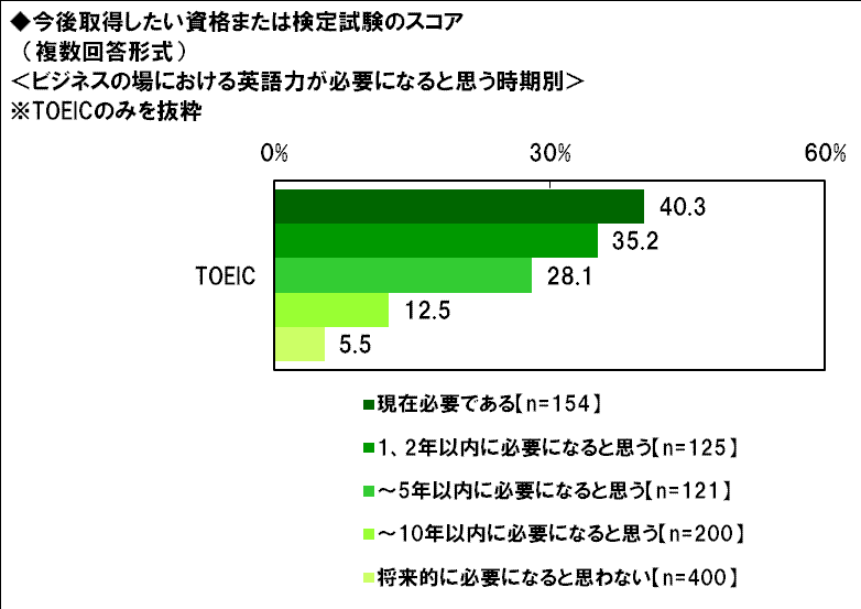 英語関連の資格・検定試験を性年代別でみると、「TOEIC」では、20代男性(23.5%)、20代女性(21.6%)、30代女性(22.2%)でそれぞれ2割を超えました。また、ビジネスの場で現在英語が必要な人(154名)では40.3%、今後1、2年以内に必要になると思う人(125名)では35.2%が、今後「TOEIC」を受けたいと回答しました。