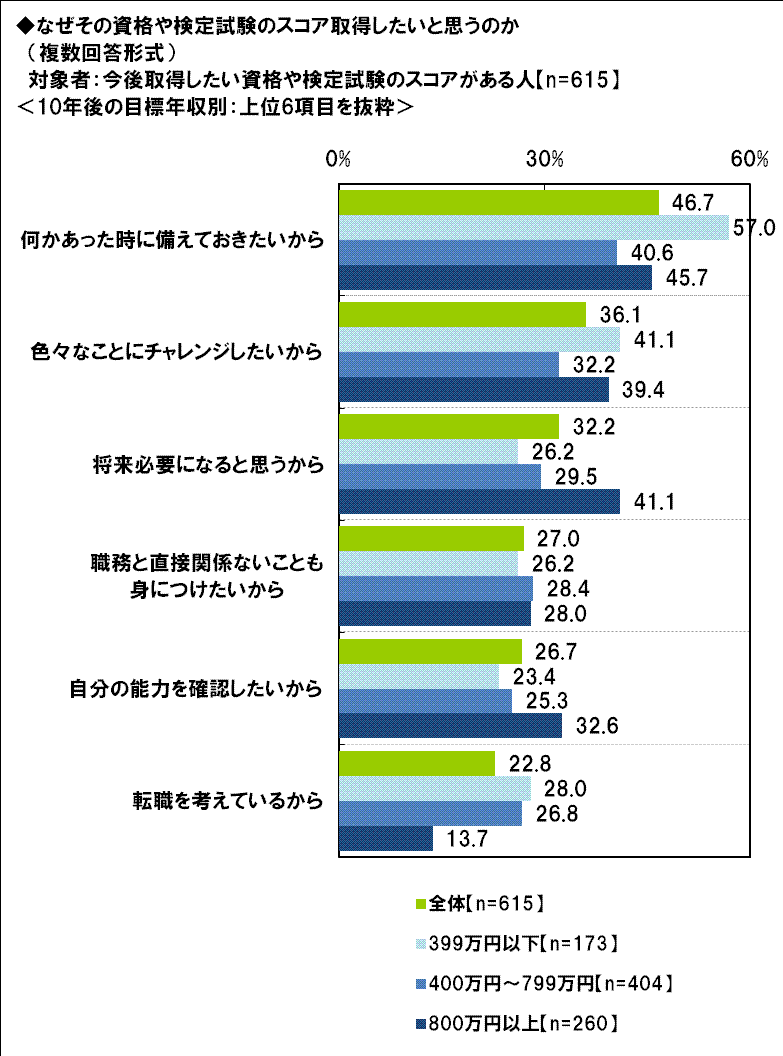 10年後の目標年収別にみると、「何かあった時に備えておきたいから」は399万円以下(107名)で57.0%と他の層よりも高く、「将来必要になると思うから」、「自分の能力を確認したいから」では、目標年収が高いほど割合も高くなる傾向がみられ、800万円以上(260名)では、それぞれ41.1%、32.6%となりました。