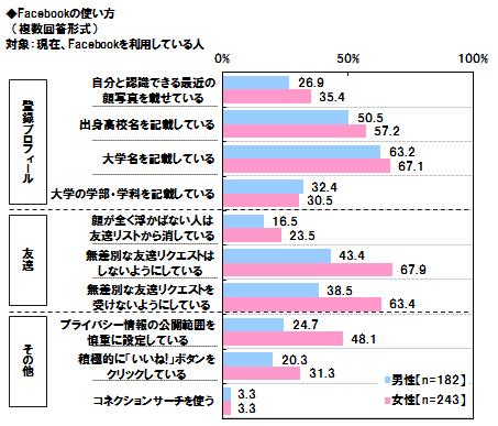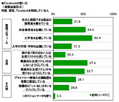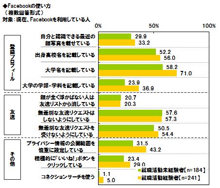 さらに、現在Facebookを利用している425名に、Facebookの利用について聞いたところ、登録プロフィールについてみると、「自分と認識できる最近の顔写真を載せている」は31.8%、学校の登録については、「出身高校名を記載している」54.4%、「大学名を記載している」65.4%、「大学の学部・学科を記載している」31.3%となりました。 次に、“友達”についてみると、友達リストについては、「顔が全く浮かばない人は友達リストから消している」が20.5%、友達リクエストについては、「無差別な友達リクエストはしないようにしている」57.4%、「無差別な友達リクエストを受けないようにしている」52.7%となりました。無差別な友達リクエストをしない、受けないようにしているのは、女性の方が割合は高く、「無差別な友達リクエストはしないようにしている」は男性43.4%に対し、女性67.9%、「無差別な友達リクエストを受けないようにしている」は男性38.5%に対し、女性63.4%と20ポイント以上女性の方が高くなりました。また、「プライバシー情報の公開範囲を慎重に設定している」でも女性の方が高い割合で、男性24.7%に対し、女性では48.1%になり、女性では男性に比べ、友達リクエストやプライバシー情報の公開に慎重な姿勢が窺えました。 そして、Facebookの特徴である“いいね!”についてみると、「積極的に『いいね!』ボタンをクリックしている」のは26.6%と4人に1人の割合となりました。また、学歴・職歴等の情報を基にした検索機能「コネクションサーチを使う」は3.3%で、就職活動経験者(現在就職活動中、または就職活動を終えた500名)でも5.0%にとどまりました。