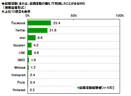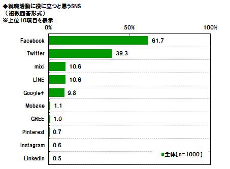 SNSを就職活動に取り入れる“ソー活”。企業の情報を収集できることや就活仲間と情報を共有できること、先輩社会人との接点になることなどがソー活のメリットとして挙げられます。 そこで、全回答者(1,000名)に、就職活動に役に立つと思うSNSを聞いたところ、「Facebook」61.7%が際立って高く、「Twitter」39.3%、「LINE」10.6%、「mixi」10.6%が続きました。 また、就職活動経験者(現在就職活動中、または就職活動を終えた500名)に、実際に就職活動で利用したことがあるSNSについて聞いたところ、「Facebook」25.4%が最多で、「Twitter」21.6%が続きました。