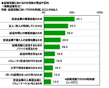 次に、就職活動におけるSNS利用の理由や目的について、就職活動経験者のうち、就職活動においてSNSを利用したことがある207名の回答をみると、「志望企業の情報収集のため」55.1%が最多となり、「友人・知人が利用していたから」43.5%、「就活仲間との情報交換のため」38.2%、「志望企業で働く人の実態を探るため」30.0%、「就職活動に成功するためのノウハウを得るため」29.6%が続きました。また、「大学で利用を勧められたから」との回答も16.4%となっており、就活においてSNSの利用を勧めている大学もあるようです。