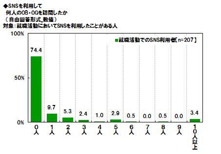 就職活動に役に立つと思うSNSでは、「Facebook」が2位以下を大きく離し6割強でトップとなり、就職活動経験者の4人に1人が就職活動で利用したことがあるSNSに「Facebook」を挙げました。就職活動におけるSNSの利用の実態をみると、志望企業についての情報や就活についてのノウハウを得るため、就活仲間との情報交換のために、利用されている様子が窺えました。また、割合としてはまだ高くはありませんでしたが、ネットの世界だけで完結しているのではなく、OB・OGなど先輩社会人の訪問や就活仲間と知り合うきっかけとしてSNSが利用されている様子が窺えました。 また、先輩社会人への訪問数、知り合った就活仲間の人数ともに《英語を日常的に使う企業へチャレンジした・したいと思う人》の方が大きく上回っており、英語使用企業へのチャレンジ同様、就活におけるコミュニケーションツールとしてのSNS利用も積極的な様子が窺えました。