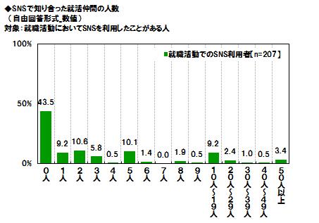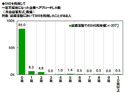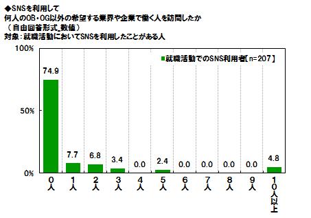 さらに、就職活動経験者のうち、就職活動においてSNSを利用したことがある207名に、SNSを利用しての先輩社会人の訪問やSNSで知り合った就活仲間の人数を聞きました。 まず、【SNSを利用して何人のOB・OGを訪問したのか】をみると、「10人以上」(3.4%)との回答もみられましたが、平均(0人との回答も含む平均、以下同様)は1.1人となり、【SNSを利用してのOB・OG以外の希望する業界や企業で働く人の訪問】でも平均は1.1人でした。続いて、【SNSで知り合った就活仲間の人数】を聞いたところ、「50人以上」との回答も3.4%あり、平均は6.8人という結果となりました。また、【SNSを利用して、一度不採用になった企業へアプローチした数】を聞いたところ、「0社」が85.0%でしたが、一度不採用になった企業へSNSを利用して再度アプローチしたことがある就活生の存在も確認することができ、「1社」6.3%、「2社」4.8%となりました。