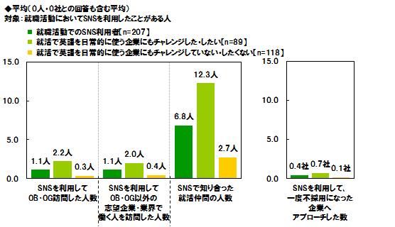 《就職活動で英語を日常的に使う企業にもチャレンジした・したいと思う人》(89名)の平均をみると、SNSを利用してOB・OG訪問した人数は2.2人、OB・OG以外の希望する業界や企業で働く人を訪問した人数では2.0人となり、《チャレンジしていない・したいと思わない人》(118名)の平均(OB・OG訪問0.3人、OB・OG以外の訪問0.4人)に比べ多い結果となりました。また、SNSで知り合った就活仲間の人数の平均をみると、《就職活動では英語を日常的に使う企業にもチャレンジした・したいと思う人》(89名)では12.3人で、《チャレンジしていない・したいと思わない人》(118名)の平均2.7人を大きく上回り、就職活動において英語を日常的に使う企業に対して積極的な層は、SNSを利用したOB・OGやOB・OG以外の先輩社会人の訪問、就活仲間づくりでも積極的な様子が窺えました。