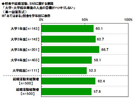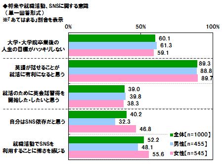 大学・大学院卒業後の目標がハッキリしないという回答が全体では6割、学年別にみても大学院生を含むいずれの学年でも半数を超える結果となり、就職活動経験者を含めて卒業後の目標を決めかねている様子が窺えます。また、英語力が就活に有効だと思う割合(89.3%)に対して、実際に習得を開始した人の割合(39.0%)が少なくなっていることから、就活に向けての行動を起こしかねている様子も窺えます。 また、SNSについて、4割が「自分はSNS依存だと思う」と回答しており、特に女性ではその割合が高くなる結果となりました。その一方で、「就職活動でSNSを利用することに怖さを感じる」割合は、女性が男性を上回っており、女性の方が、頻繁にSNSを利用しつつも、就活でのSNS利用は怖いと感じている人が多い様子が窺えました。