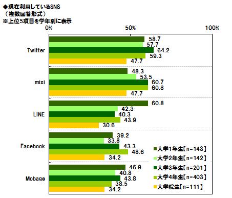 ◆現在利用のSNS トップは「Twitter」、大学1年生では「LINE」がトップ グラフ1|グラフ2|グラフ3|グラフ4