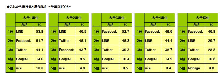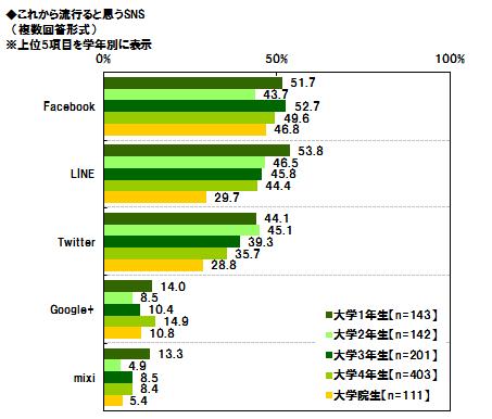 次に、これから流行ると思うSNSを聞いたところ、「Facebook」49.4%が最多となり、「LINE」44.7%、「Twitter」38.2%、「Google+」12.5%が続きました。男女別にみて、大きな差がみられたのは「LINE」で、男性37.8%に対し、女性では50.5%と半数がこれから流行ると思うSNSとし、1位の「Facebook」(51.9%)とほぼ同率となりました。学年別にみると、大学1年生、大学2年生では「LINE」(大学1年生53.8%、大学2年生46.5%)が1位となり、大学3年生以上の学年では「Facebook」(大学3年生52.7%、大学4年生49.6%、大学院生46.8%)が1位となりました。