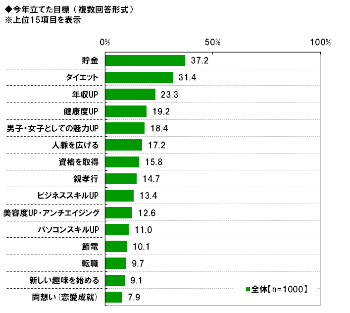 今年立てていた目標をみると、最も多かったのは「貯金」37.2%で、次いで「ダイエット」31.4%、「年収UP」23.3%、「健康度UP」19.2%、「男子・女子としての魅力UP」18.4%が続きました。また、「目標は立てていない」は17.8%でした。