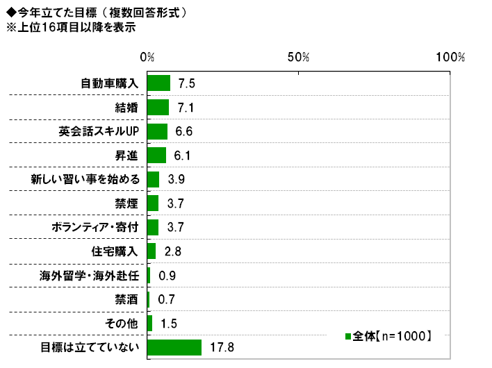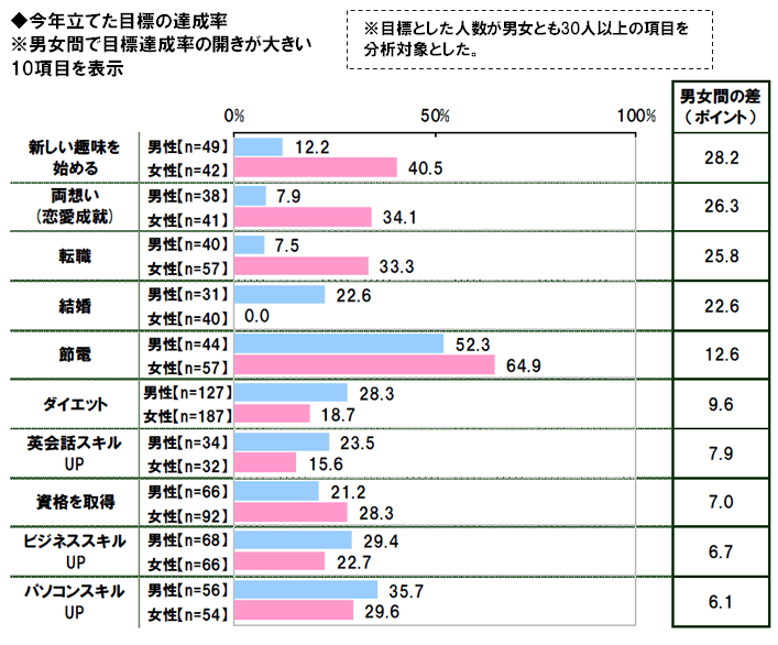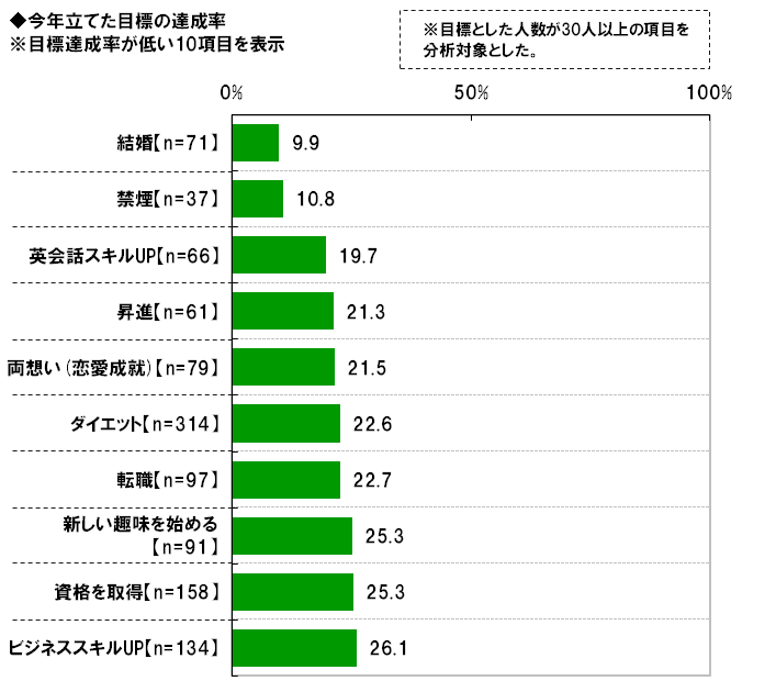 また、達成率が低かった目標についてもみると、最も達成率が低かったのは、「結婚」9.9%で、「禁煙」10.8%、「英会話スキルUP」19.7%、「昇進」21.3%、「両想い(恋愛成就)」21.5%が続きました。