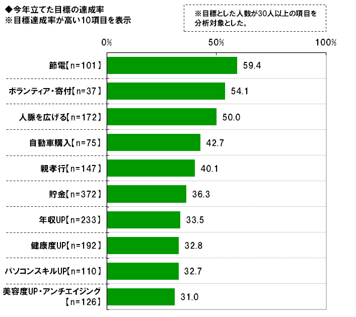 続いて、各目標の目標達成率(※)をみると、最も達成率が高かった目標は、「節電」59.4%で、次いで、「ボランティア・寄付」54.1%、「人脈を広げる」50.0%、「自動車購入」42.7%、「親孝行」40.1%が続きました。