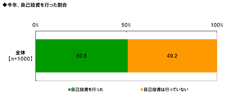 まず、どれくらいのビジネスパーソンが自己投資に取り組んだのかをみると、自己投資を行ったビジネスパーソンは50.8%、自己投資を行っていないビジネスパーソンは49.2%と拮抗する結果となりました。