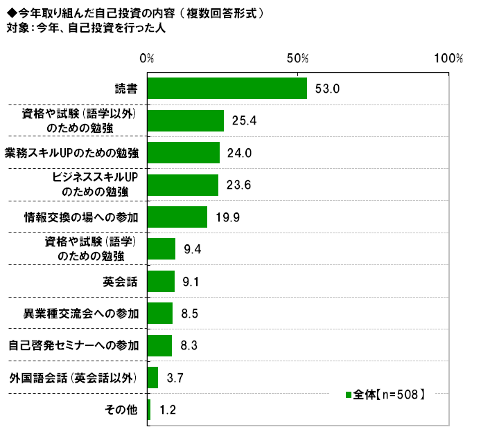 自己投資を行った508名について、今年取り組んだ自己投資の内容をみると、「読書」53.0%が最も多く、「資格や試験(語学以外)のための勉強」25.4%、「業務スキルUPのための勉強」24.0%、「ビジネススキルUPのための勉強」23.6%、「情報交換の場への参加」19.9%が続きました。