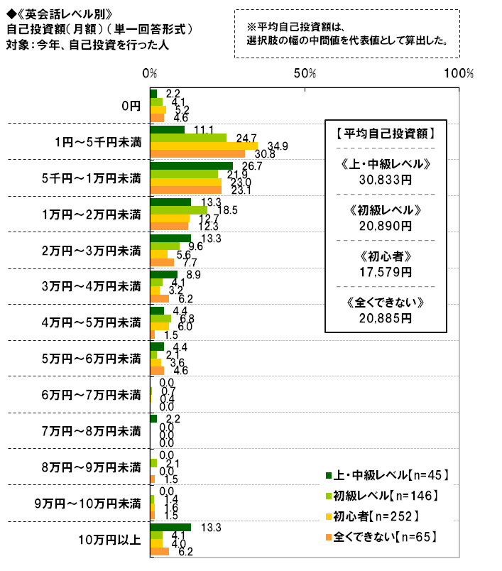 これを英会話レベル別にみると、上・中級レベル(ネイティブ・日常会話が可能レベル)では、「10万円以上」が13.3%と1割を超え、平均は30,833円で他のレベル(初級レベル20,890円、初心者17,579円、全くできない20,885円)より1万円近く高くなりました。