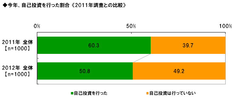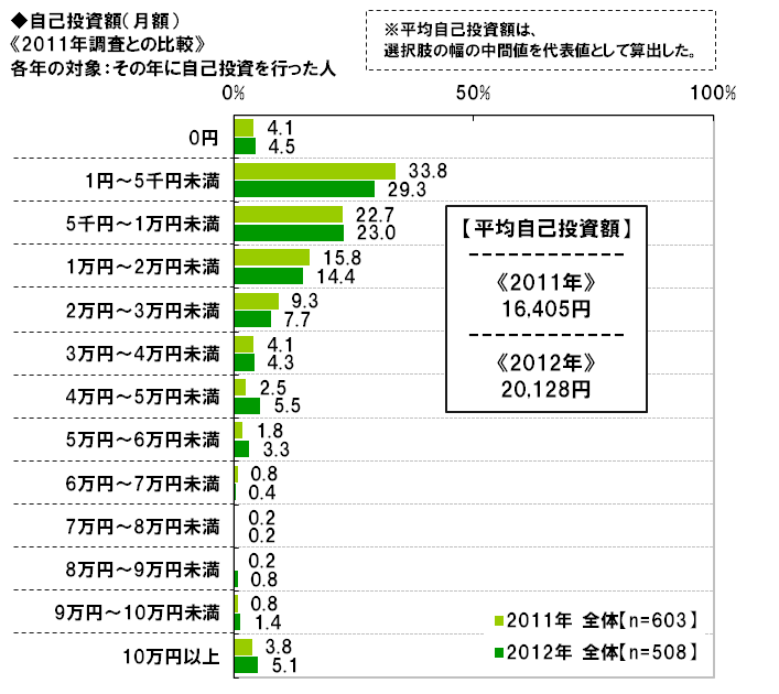 昨年同時期(2011年11月19日~11月24日)に行った調査と比較をすると、自己投資に取り組んだビジネスパーソンの割合(2011年調査60.3%、今回50.8%)は約10ポイント下がりましたが、平均金額(2011年調査16,405円、今回20,128円)は約4,000円上昇しました。