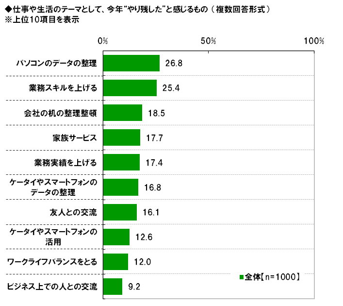 ビジネスパーソンが何に“やり残し”を感じているのかをみると、最も多かったのは「パソコンのデータの整理」で26.8%、「業務スキルを上げる」25.4%が僅差で続き、以下、「会社の机の整理整頓」18.5%、「家族サービス」17.7%、「業務実績を上げる」17.4%の順で続きました。