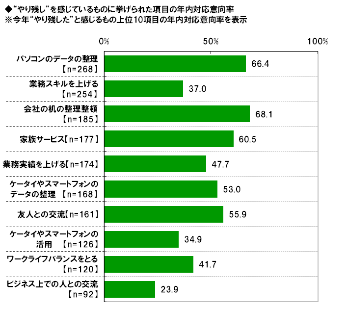 また、“やり残し”を感じているものに挙げられた項目の年内対応意向率(“今年のうちにやっておきたい”と思う割合)をみると、「パソコンのデータの整理」66.4%や「会社の机の整理整頓」68.1%では、年内に対応しようと思われている割合が他の項目より高くなり、「家族サービス」60.5%がそれらに次ぐ高さとなりました。他方、「業務スキルを上げる」37.0%や「業務実績を上げる」47.7%では半数以下にとどりました。