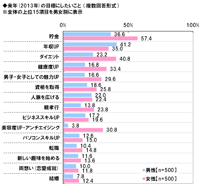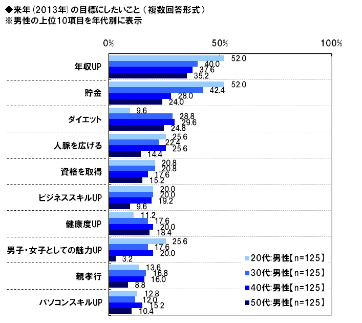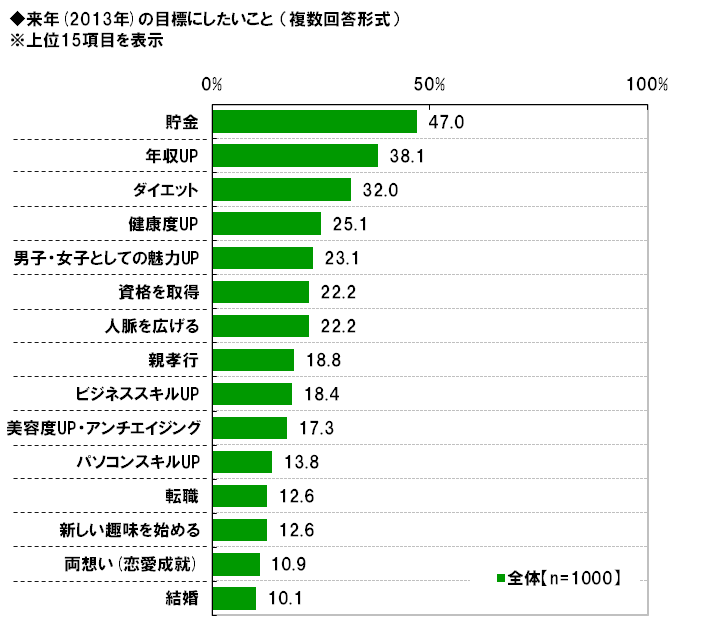 来年の目標 トップは「貯金」、ソーシャルな目標は? 20代男性では「年収UP」が半数強